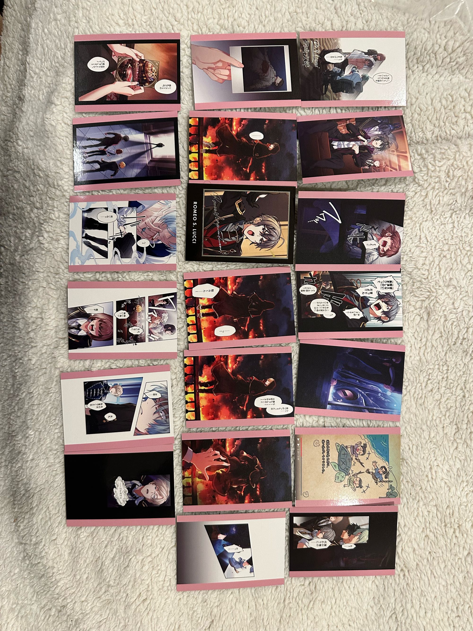 I’ll be honest, I wasn’t expecting to get a signed character at all (the trading card equivalent of the games SSRs) so I was thoroughly surprised I got Romeo and Yuri. Yuri’s card isn’t as “rare” as Romeo’s, but still fun to have two signature cards. I also have the back of Luca’s head in two of them AND opening cut scene Rui!! 😘